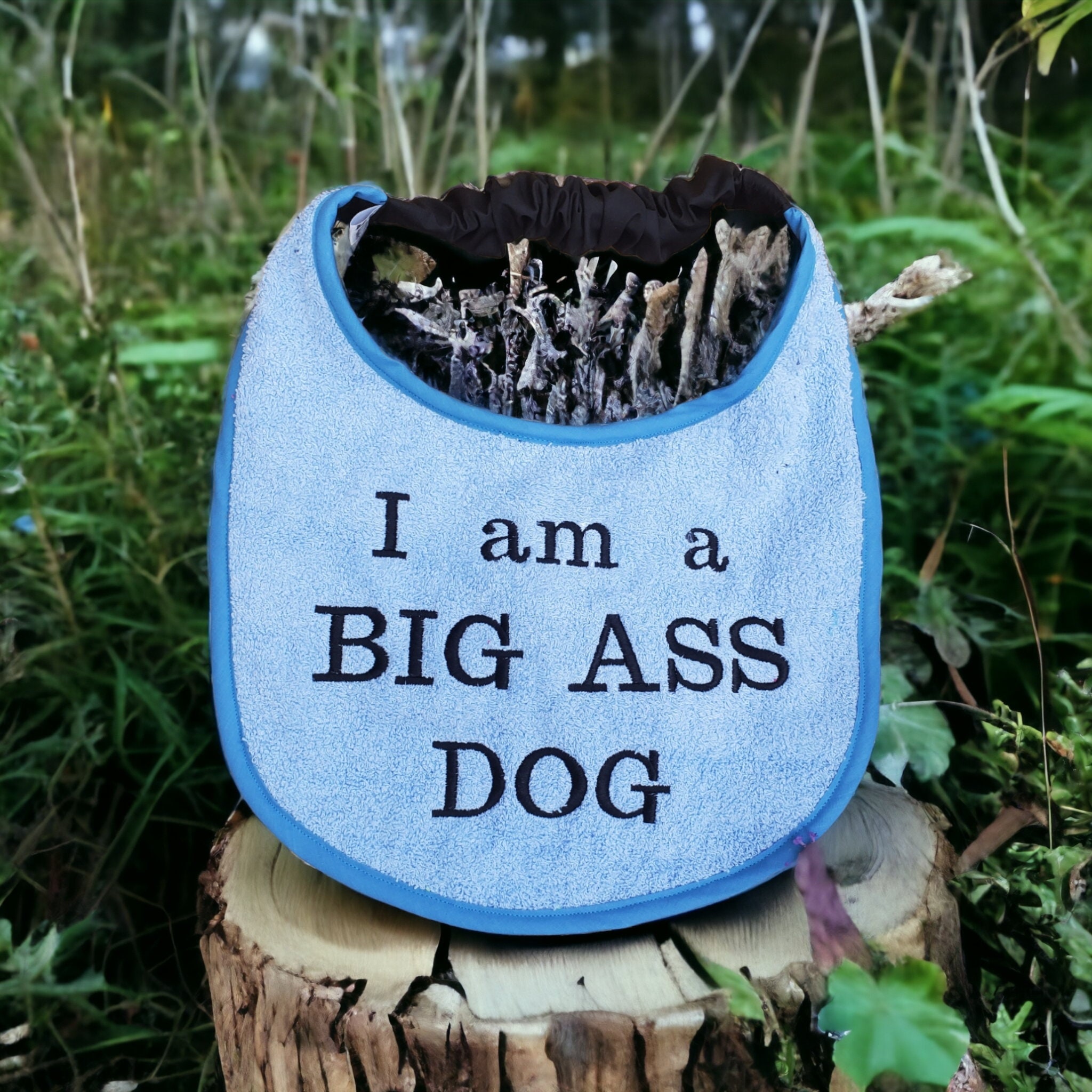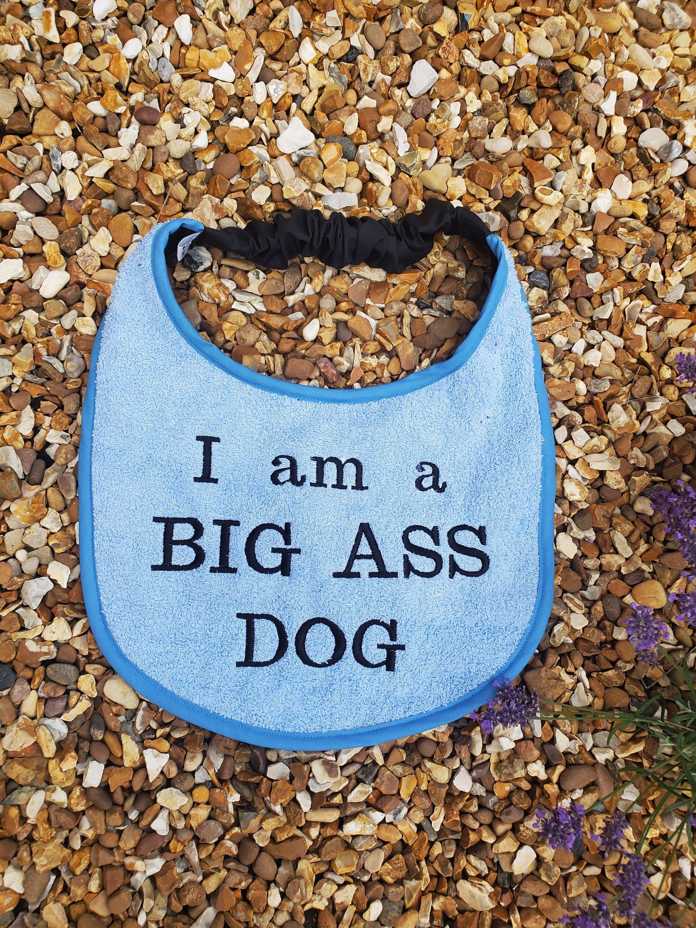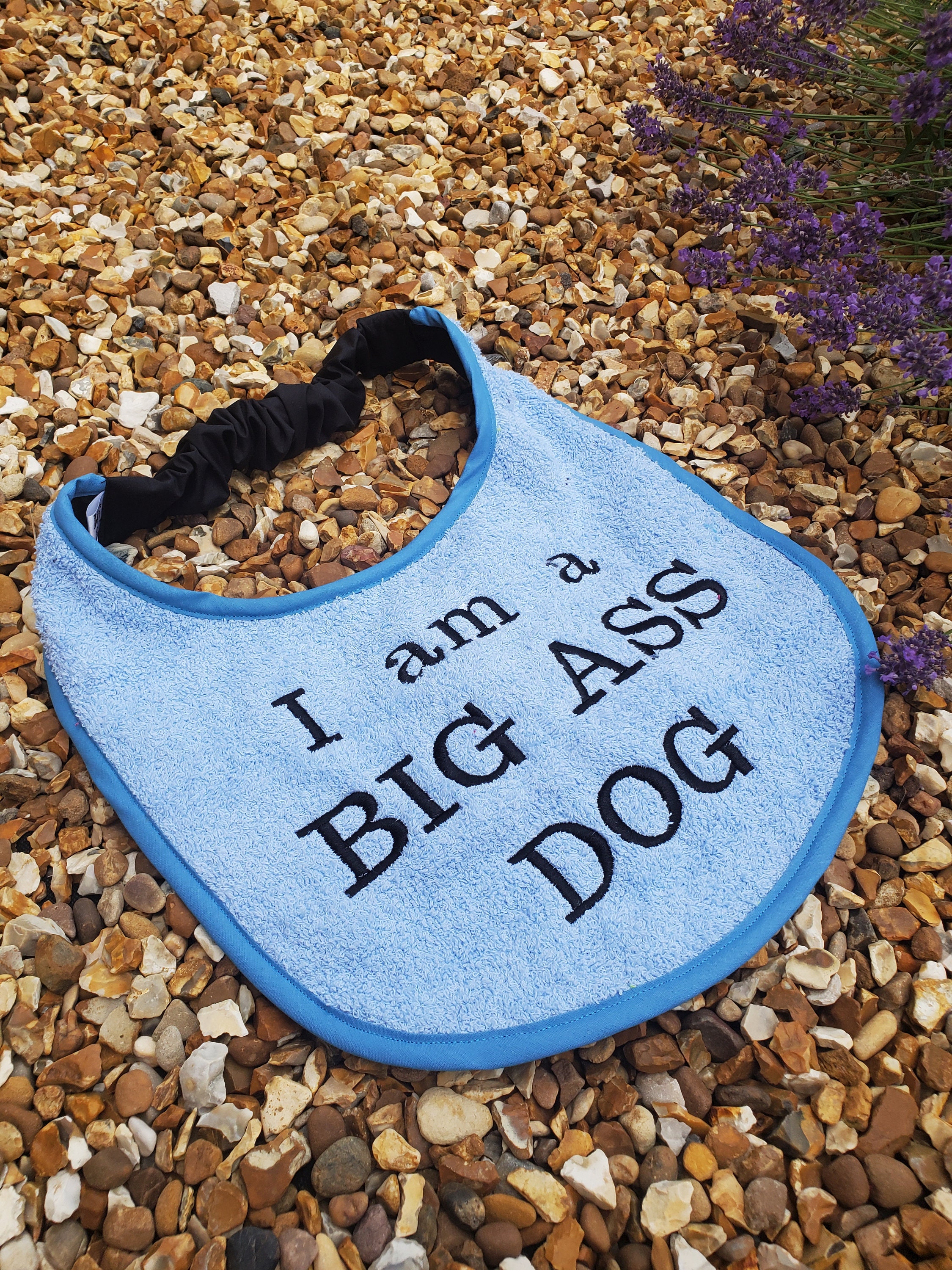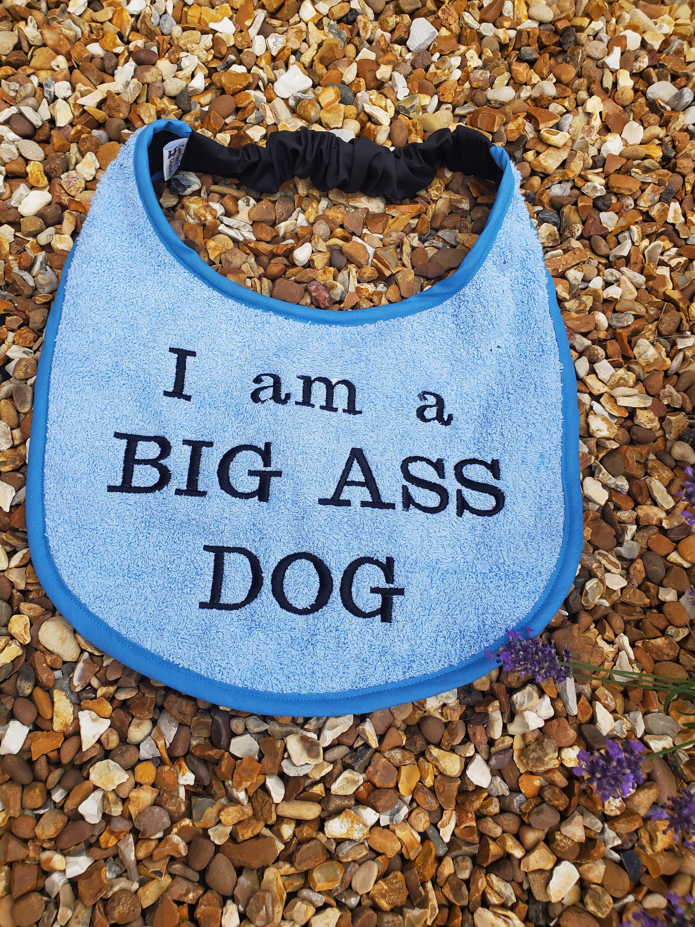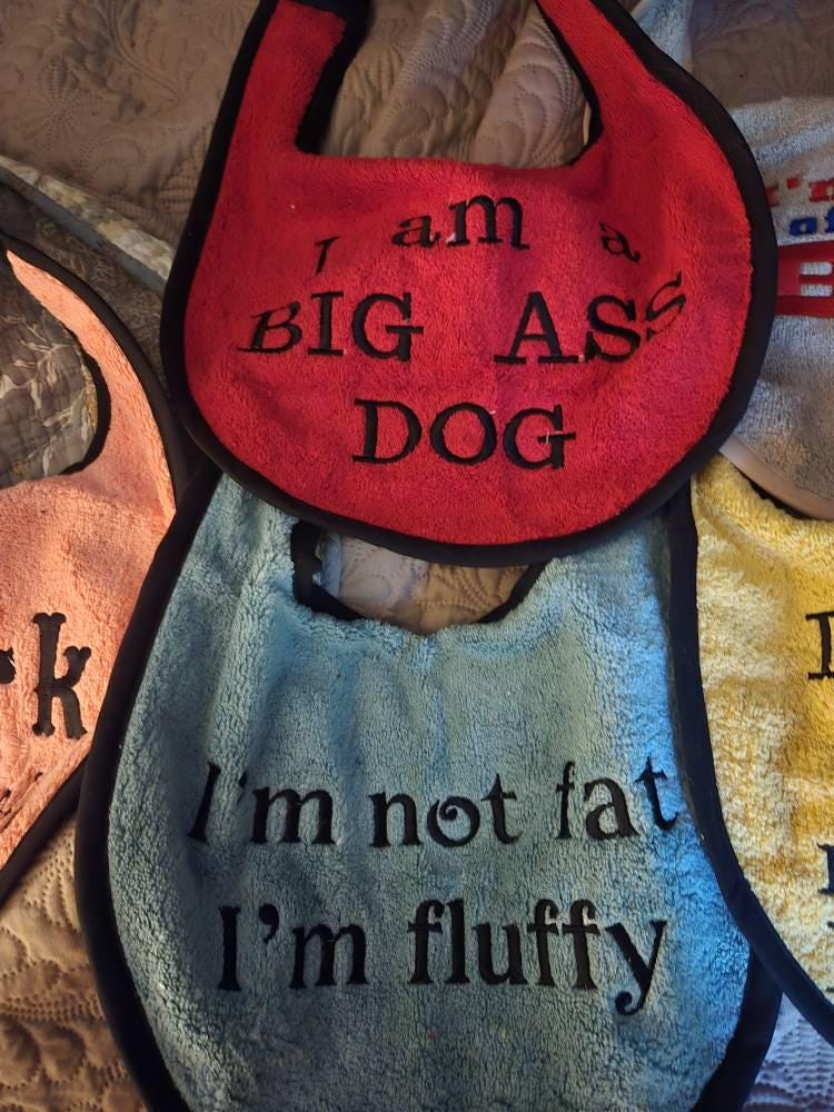 I can make to order these bibs are about 11 drop with a 19 inch to 28 inch neck, I can make this smaller or larger just leave a message at checkout , if you have a certain saying or dog you would like or even a pets name please let me know and I can do that for you x