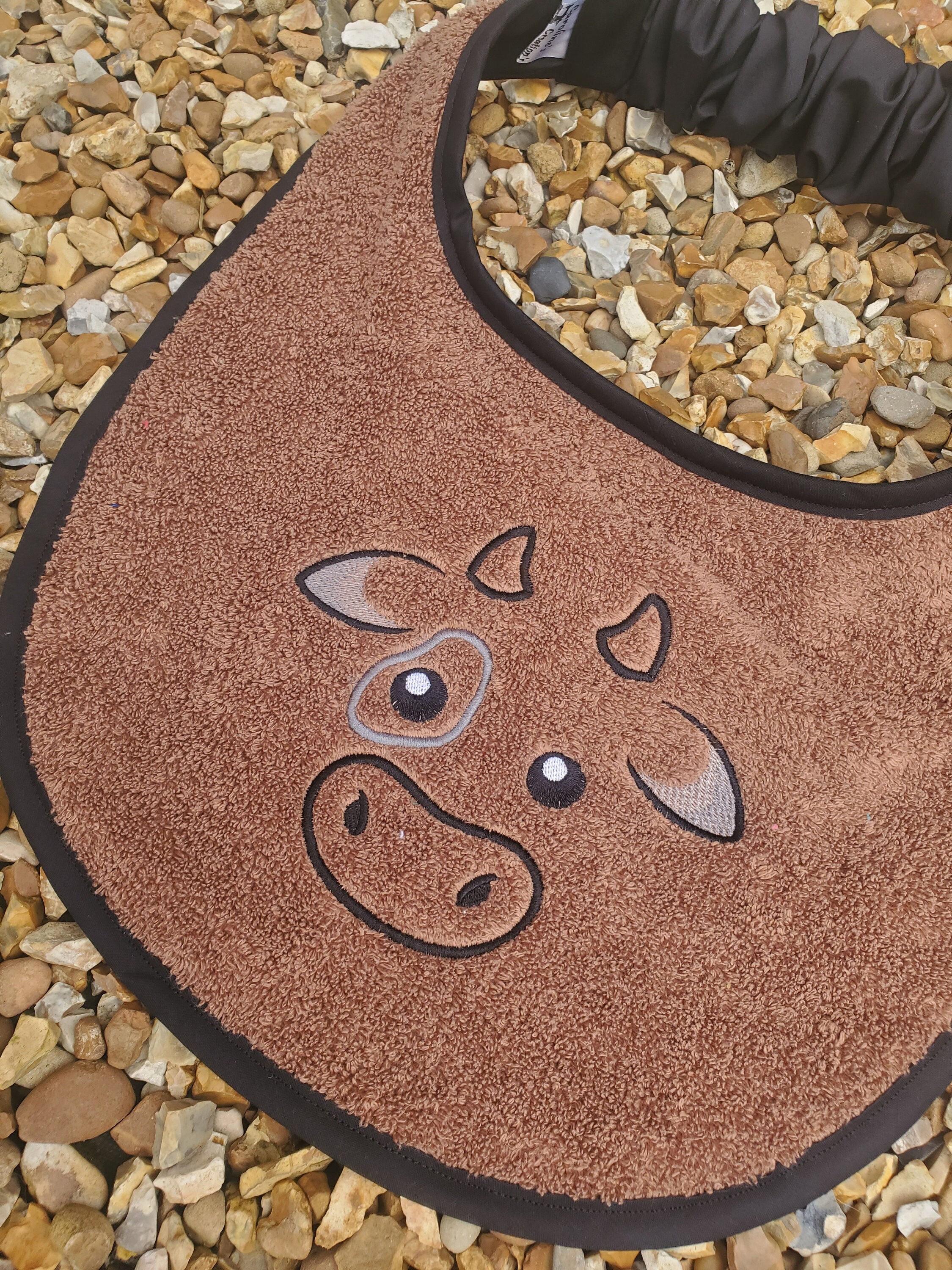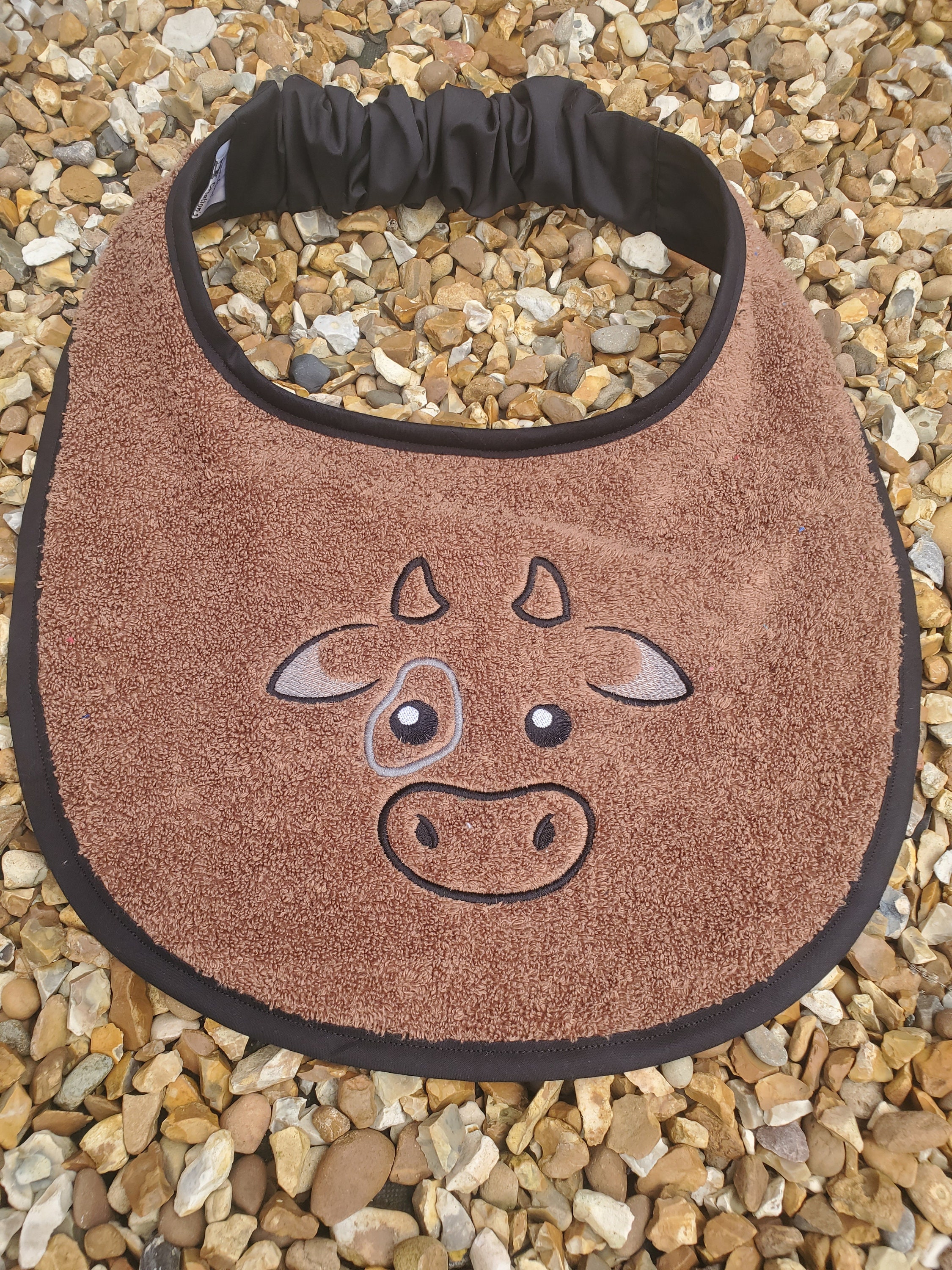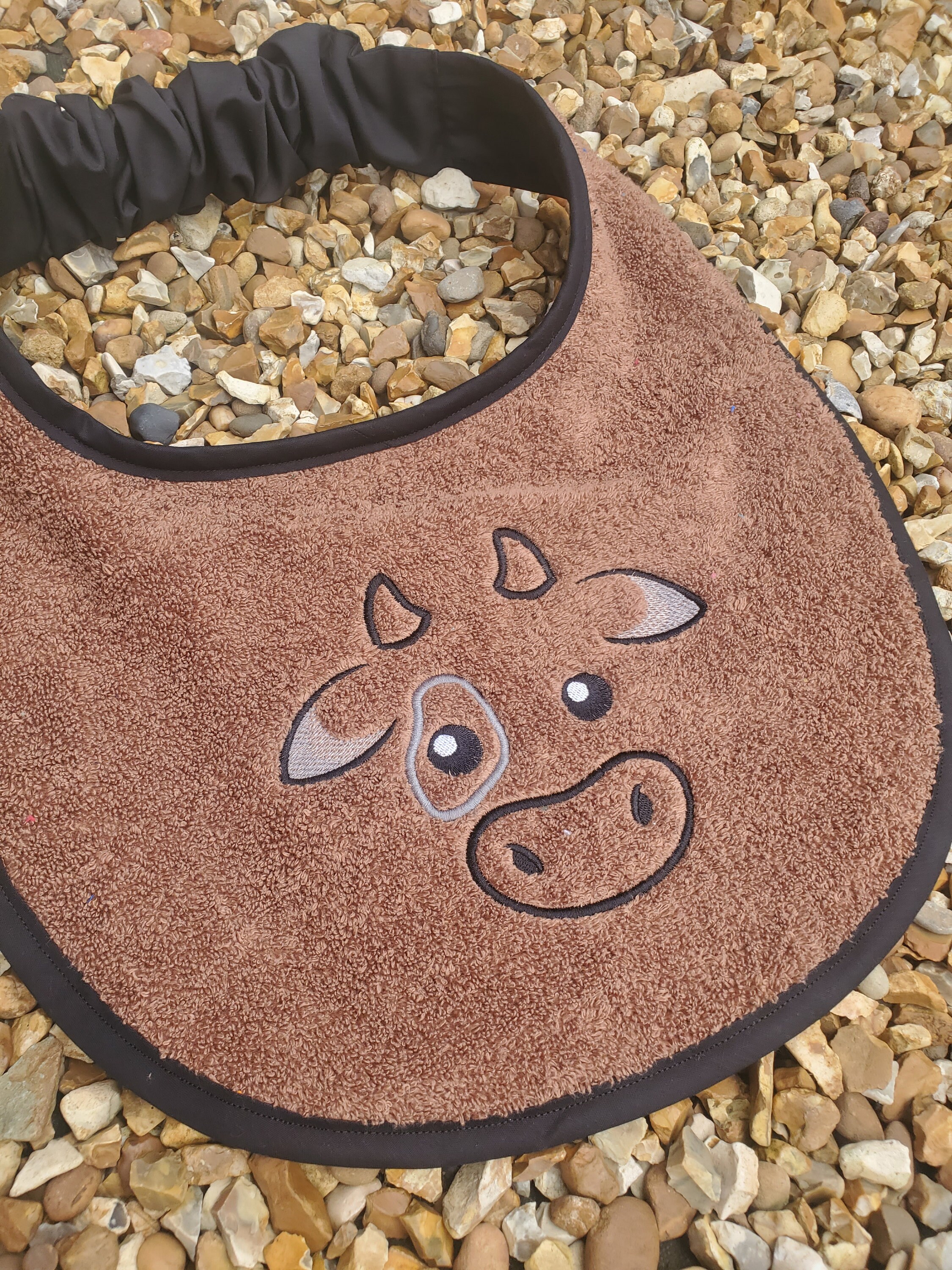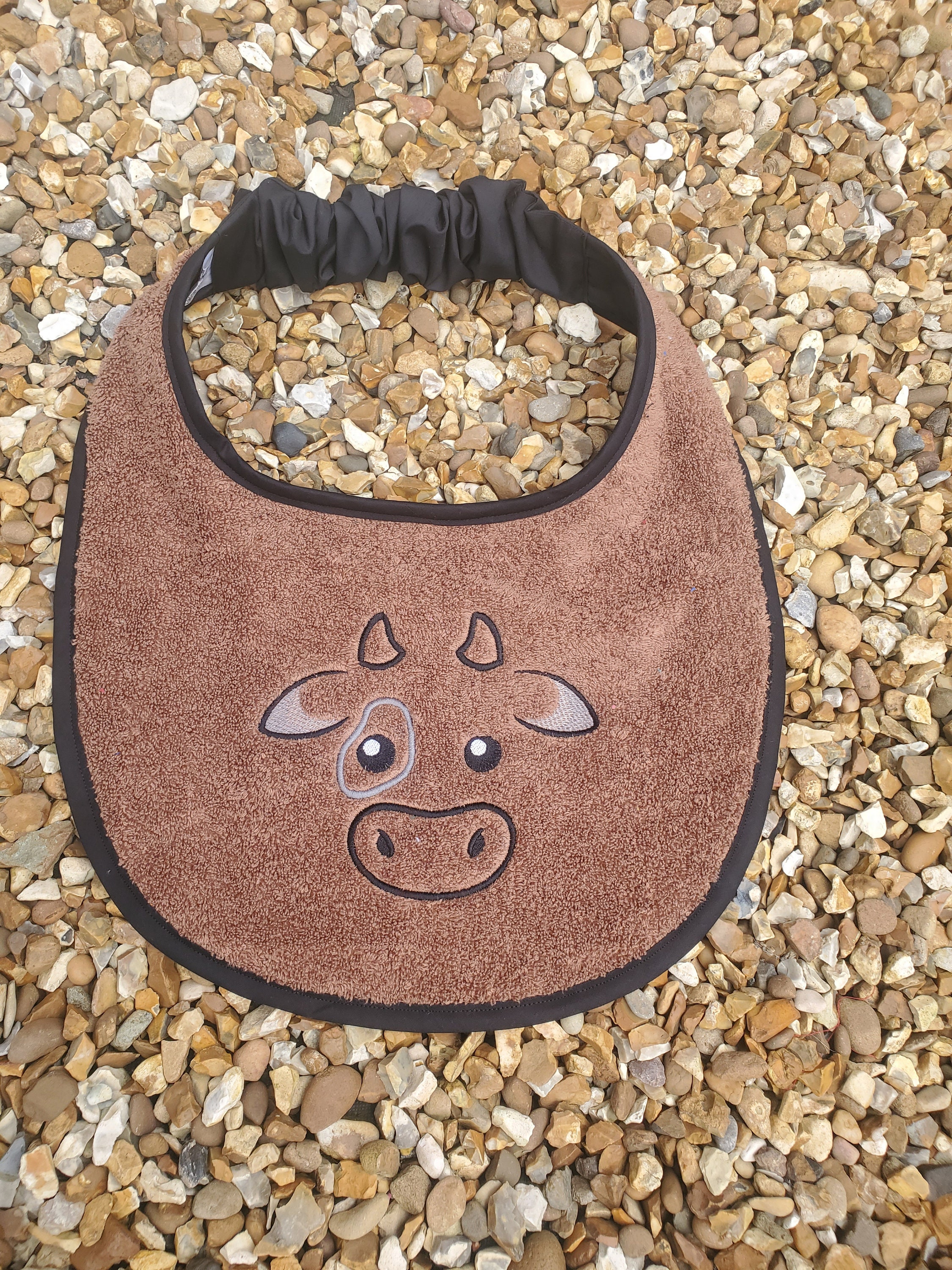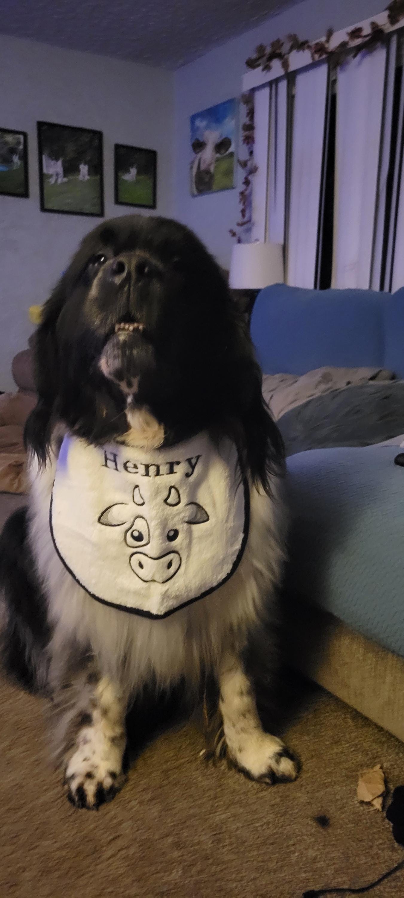 This cow bib is too cute! The quality is amazing, and I love all the color options. My dog has several of the bibs, and we are extremely pleased with them all!