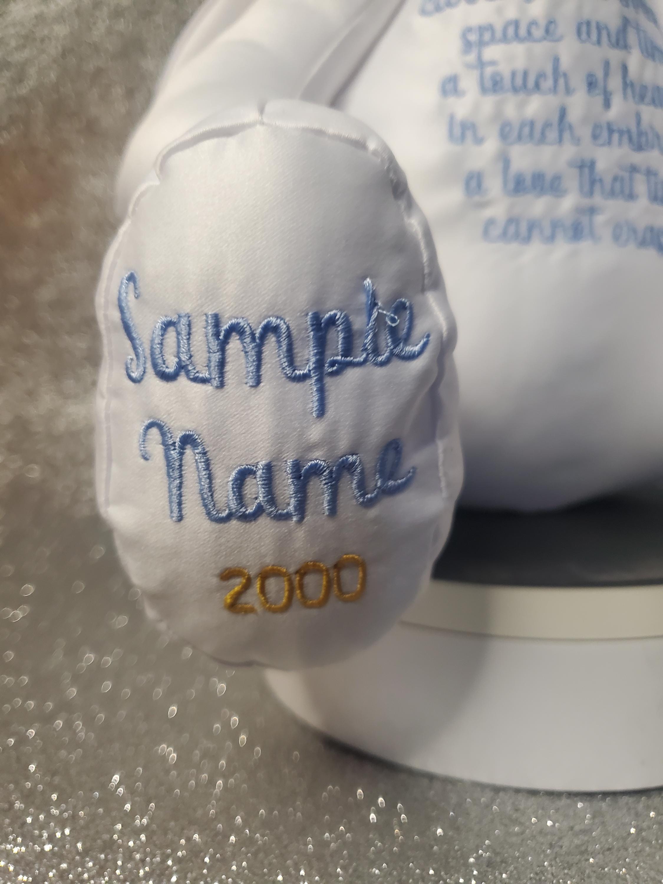 made up with Quality Satin and embroidered with s beautiful poem and personalized with any name and date om one foot and a boy or girl angel design on the other