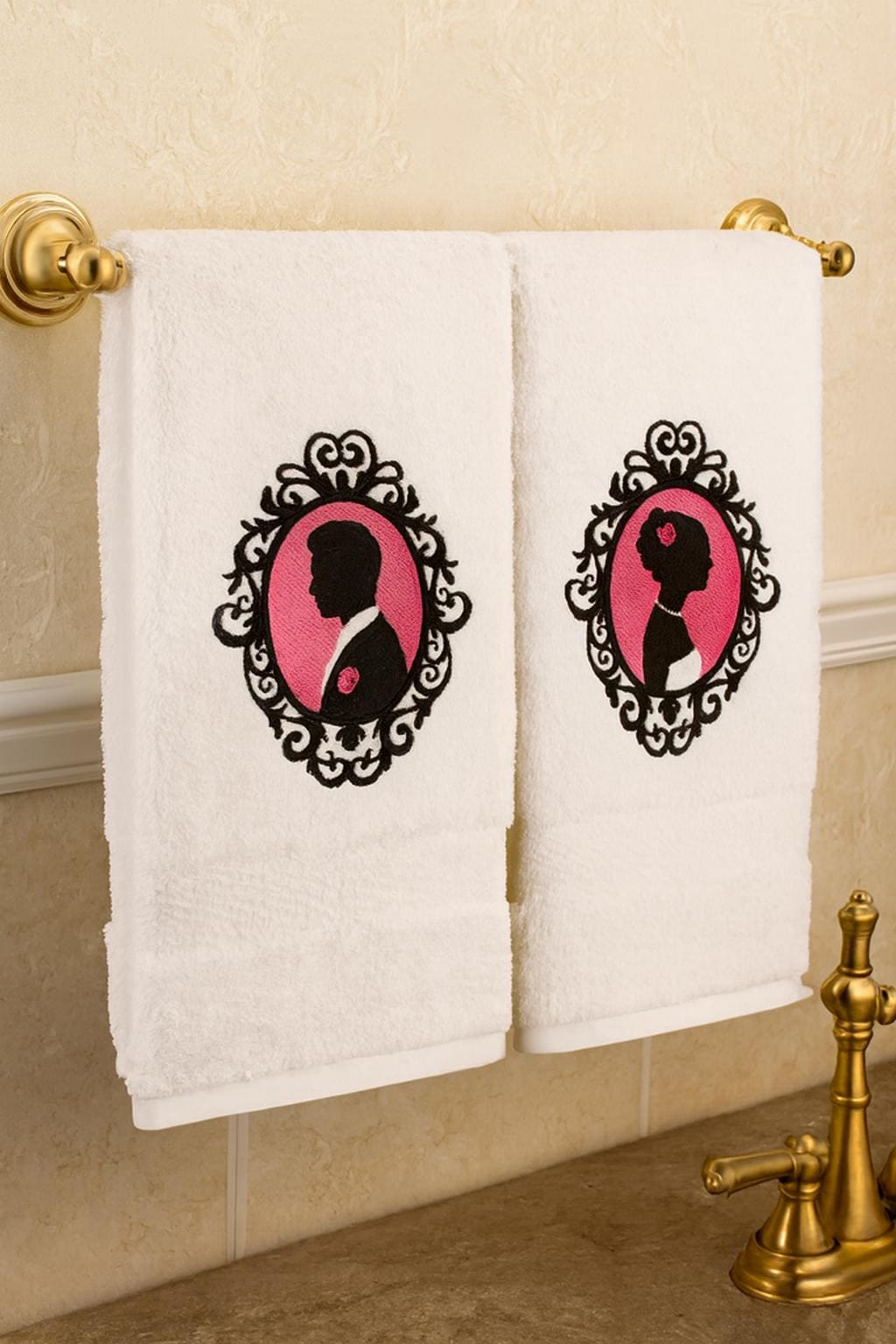 Add a touch of timeless elegance to your home with this beautiful matching his and hers embroidered towel set, inspired by classic Victorian cameo silhouettes. Featuring a gentleman and lady in ornate black frames with a rich pink background and delicate rose detailing, these towels are perfect for lovers of gothic romance, vintage style, and unique home décor.