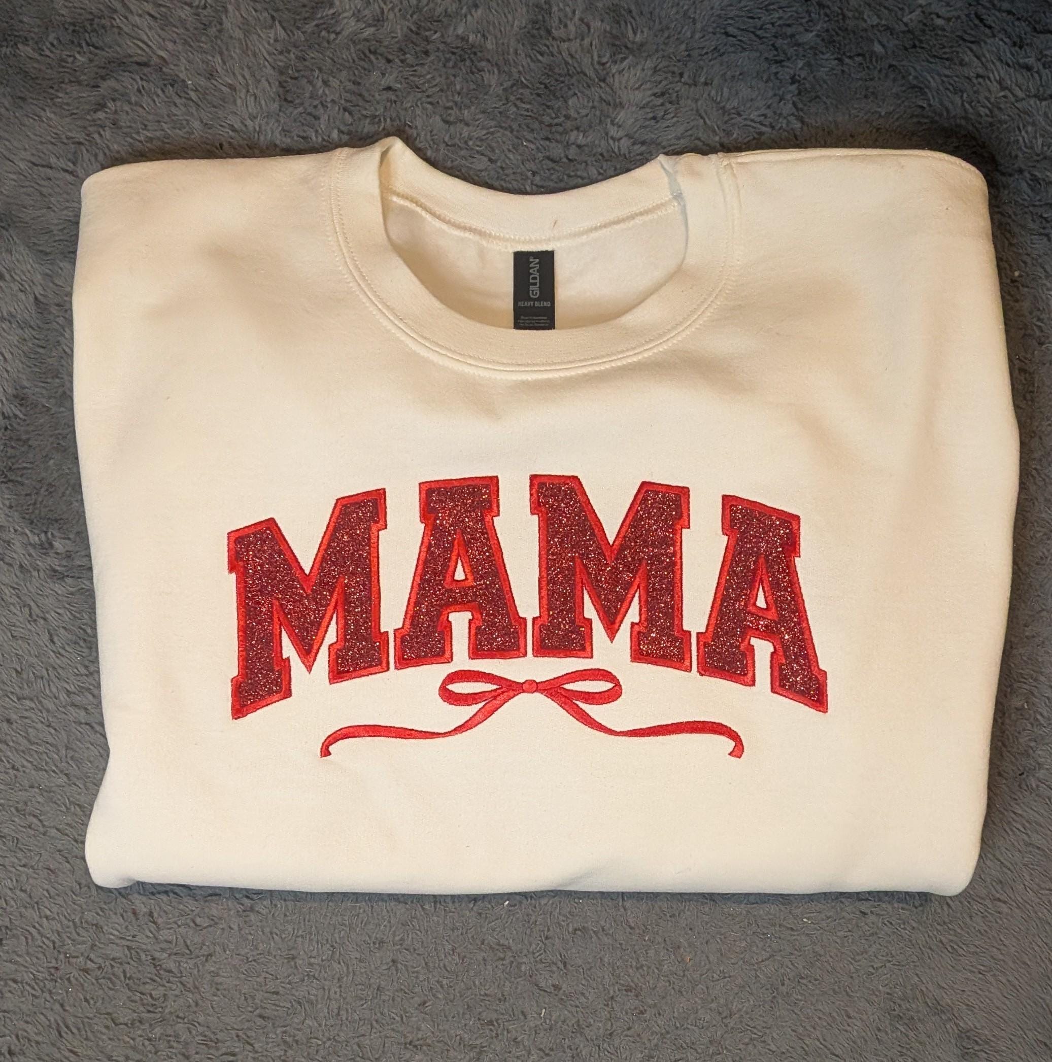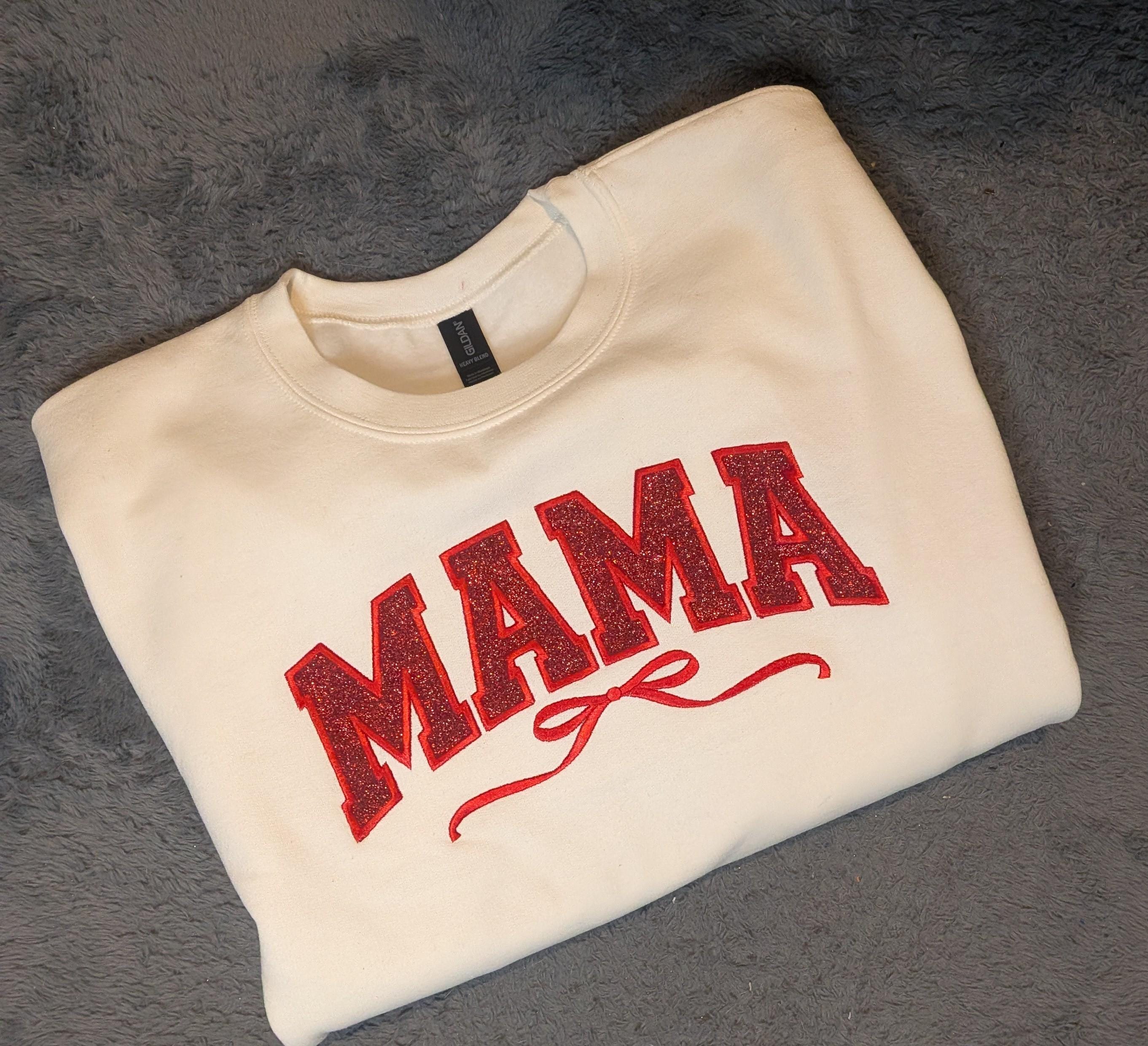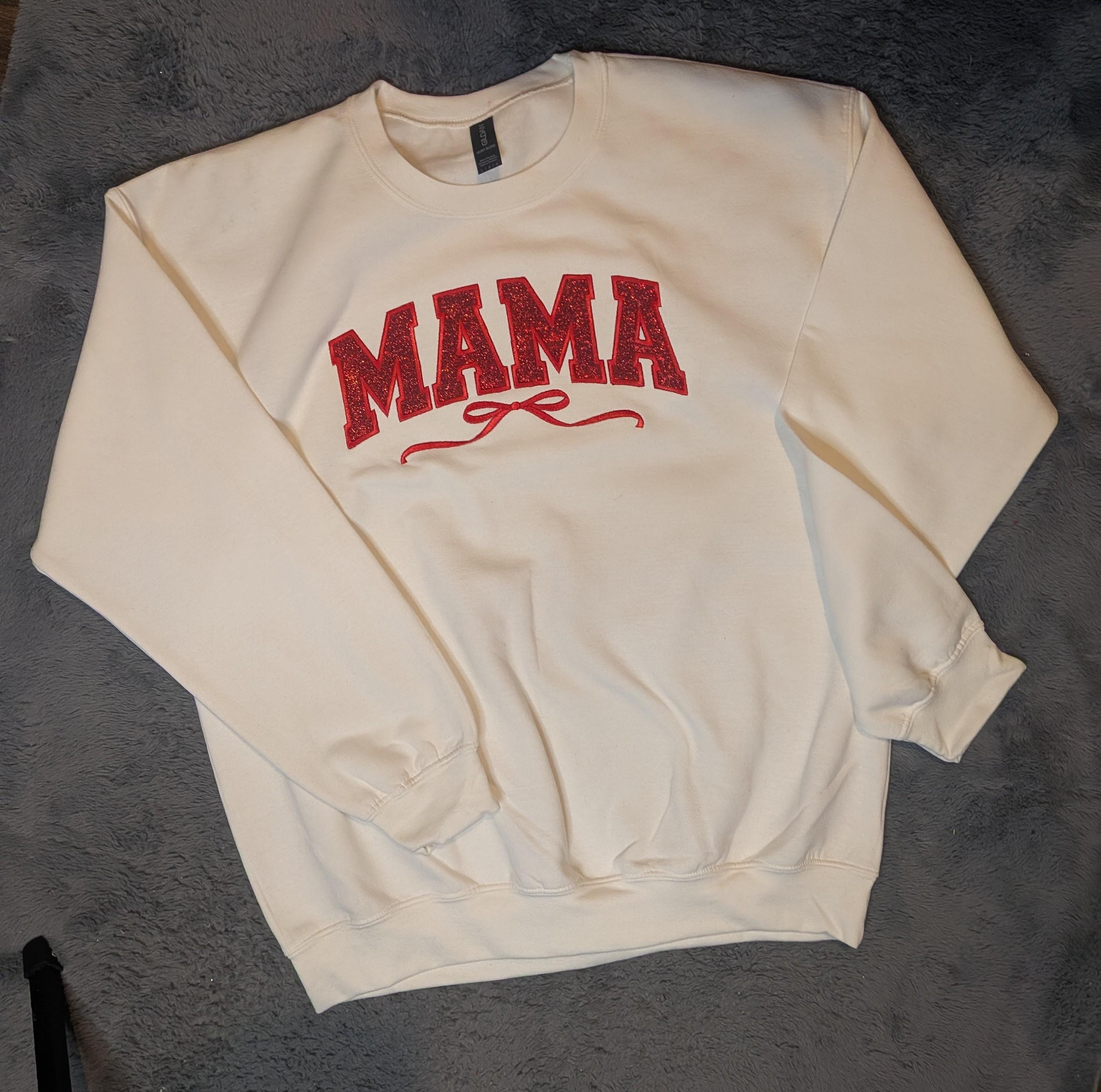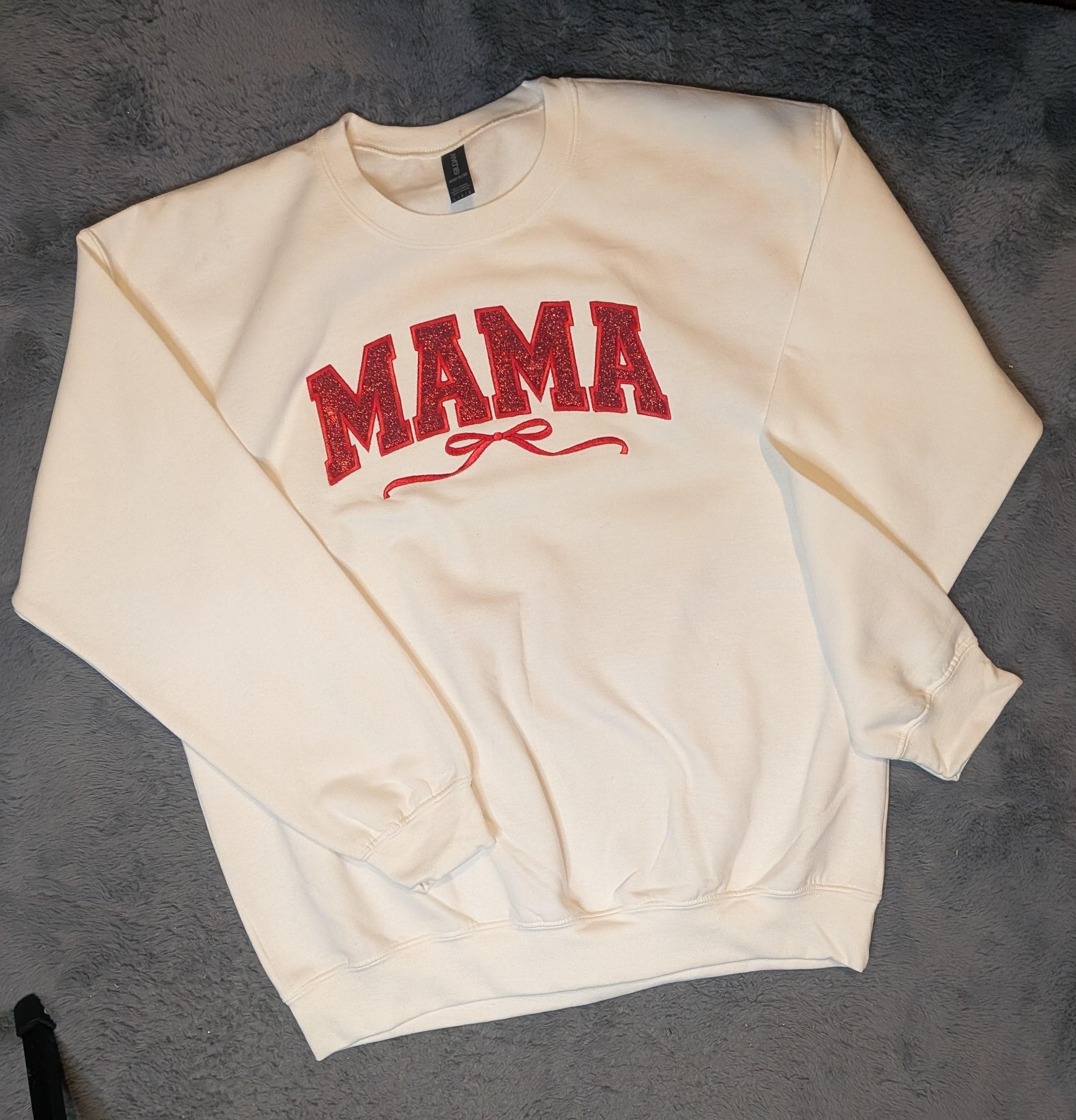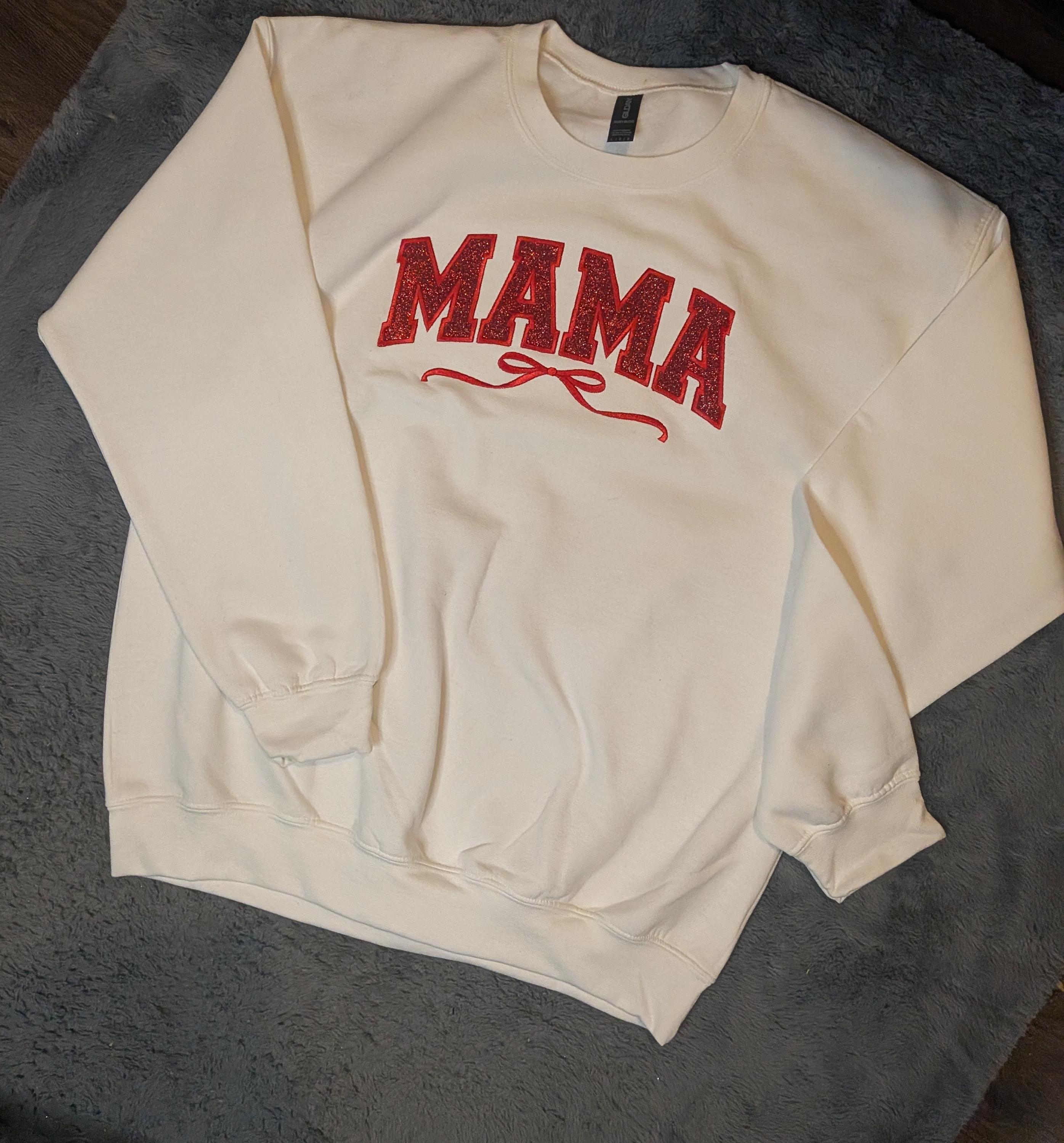 Wrap yourselfâor the mama in your lifeâin warmth and sparkle with this cozy cream sweatshirt featuring bold red glitter lettering that proudly spells MAMA. A delicate flourish beneath adds a touch of charm, making it perfect for everyday wear or special occasions.