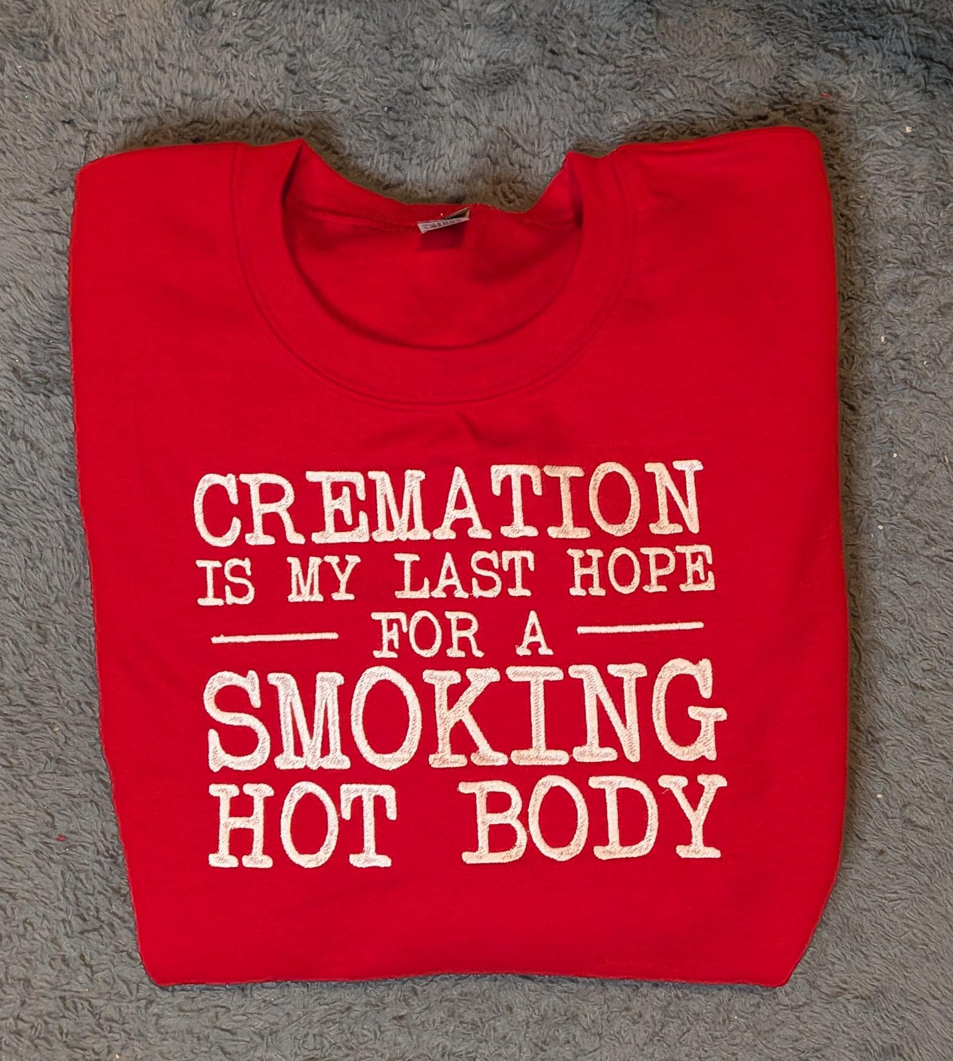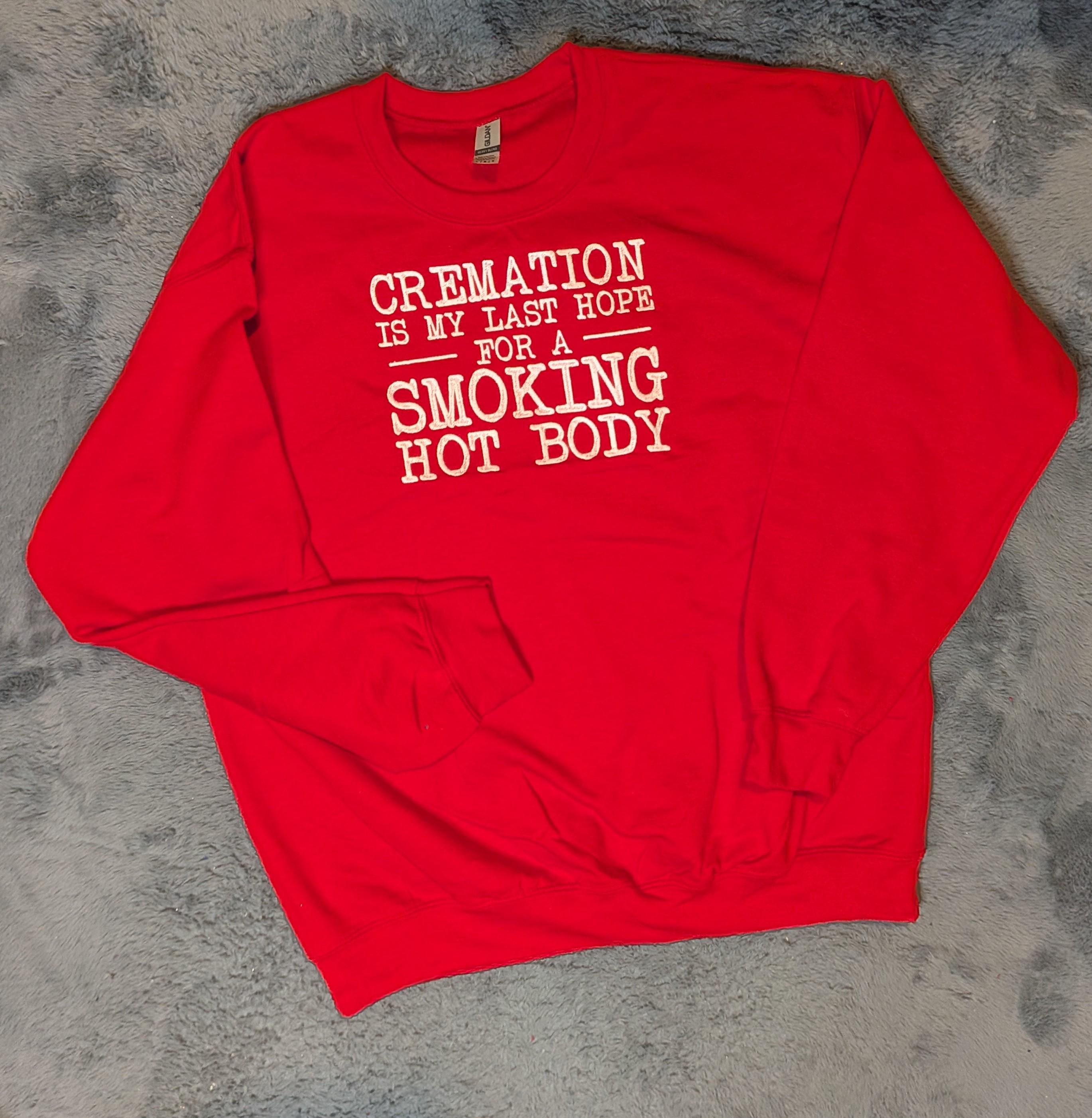 Funny Red Sweatshirt - "Cremation Is My Last Hope for a Smoking Hot Body" - Sarcastic Dark Humor Gift - Unisex Crewneck Pullover