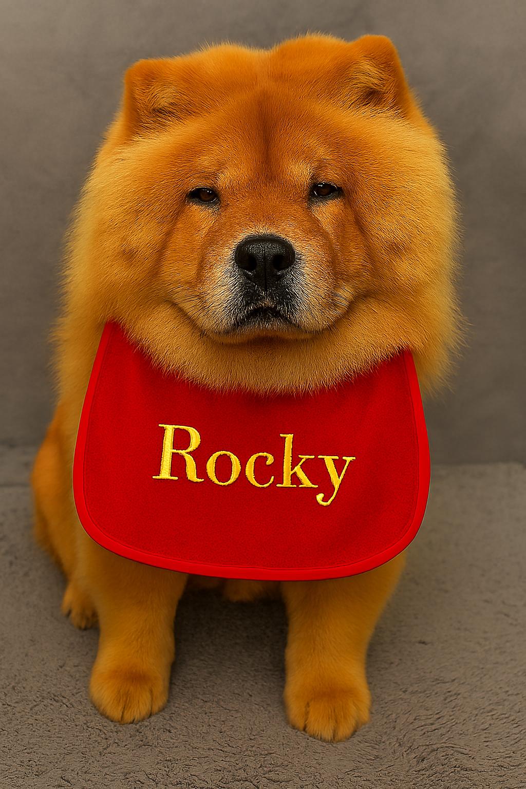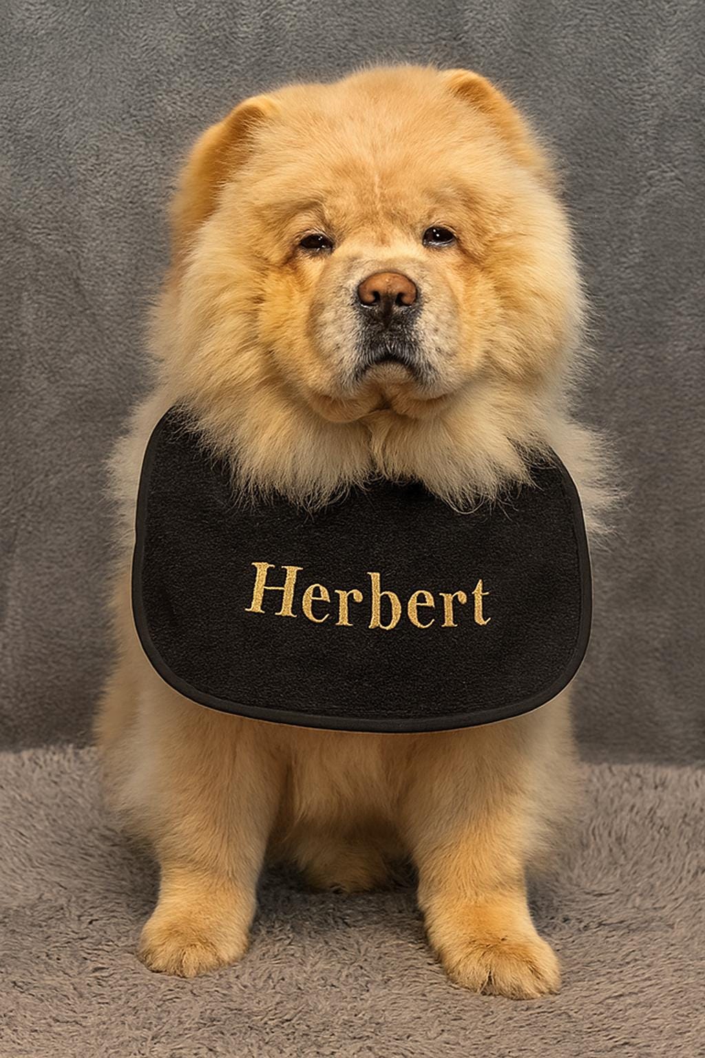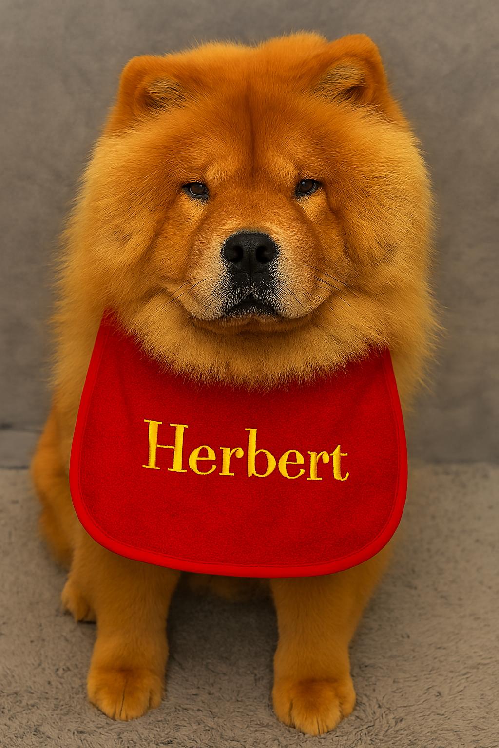 Meet Herbert, the Chow Chow with style! This personalized black bib is embroidered with your pet’s name in bold gold thread, making it a standout accessory for photo shoots, mealtime messes, or just everyday flair. Designed with an elastic neckband for easy wear, it’s perfect for fluffy friends who deserve a little extra attention.