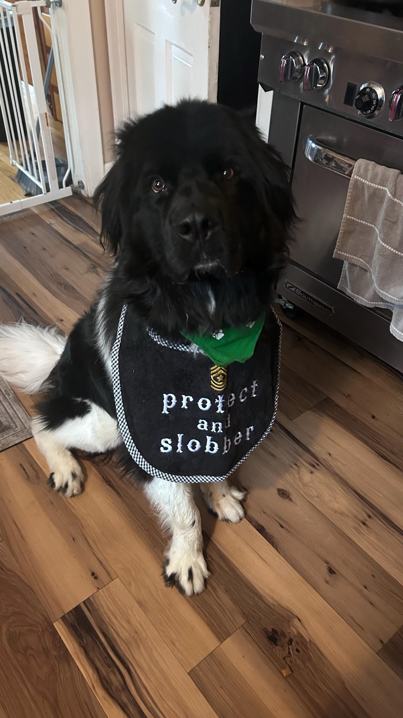 Made from super absorbent Terry Towel material, it's perfect for soaking up drool and debris during meals and drinks. The bib features a comfortable, adjustable fit to suit XXL breeds like Newfoundlands, ensuring a snug and secure fit without restricting your pet's movement. Add a personal touch with the option to customise the bib with your dog's name, making mealtime a little more pup-friendly.